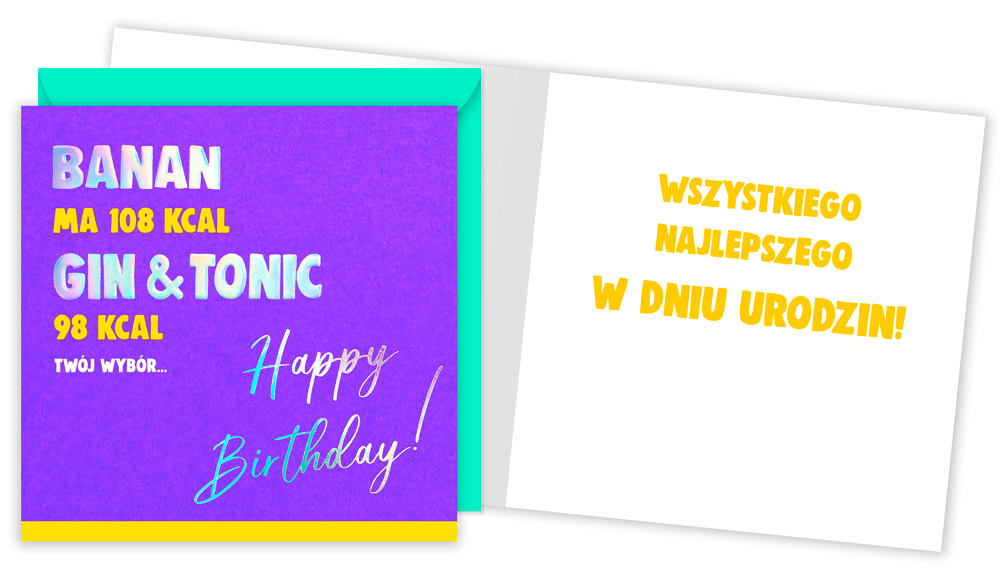 W środku znajduje się krótkie hasło z życzeniami oraz miejsce na własną dedykację, dzięki czemu możesz dodać osobisty akcent. Srebrna folia holograficzna nadaje całości efektowny połysk, a kontrastowa, neonowa koperta z logo producenta idealnie dopełnia zestaw.