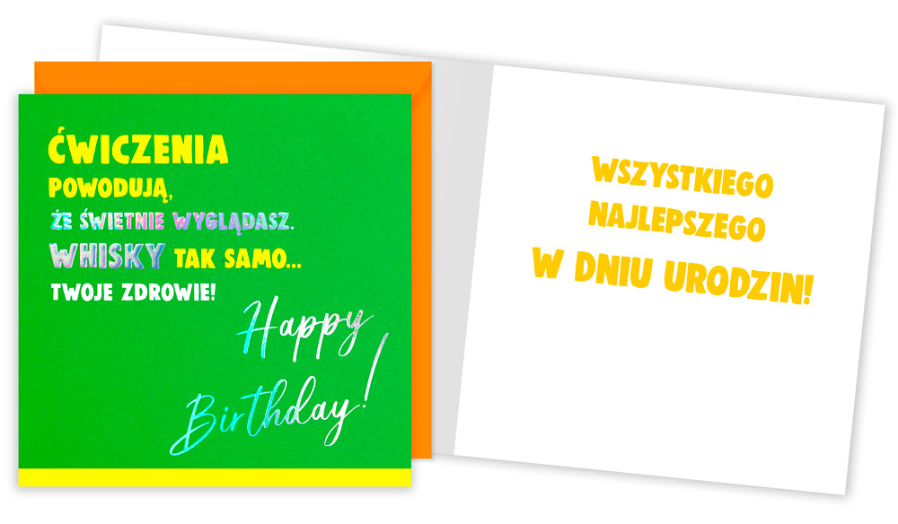 W środku znajduje się krótkie hasło z życzeniami oraz miejsce na własną dedykację, dzięki czemu możesz dodać coś od serca. Efektowne wykończenie srebrną folią holograficzną nadaje kartce nowoczesny, błyszczący akcent. Do zestawu dołączona jest kontrastowa, neonowa koperta z logo producenta, która idealnie uzupełnia całość.